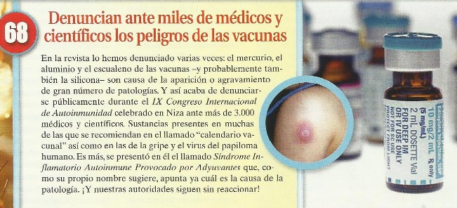 Últimas noticiasEn la publicación de julio de la revista Discovery Salud ha salido un artículo sobre la primera demanda de nuestra asociación con el bufete Almodova&Jara junto a un reportaje muy interesante sobre el IX Congreso Internacional de Autoinmunidad que se ha celebrado en Niza (Paris) ante más de 3000 médicos y científicos de todo el mundo. En este congreso se ha constatado que el aluminio y otros metales pesados pueden inducir el Síndrome autoinmune/inflamatorio inducido por adyuvantes (ASIA). Christopher Shaw, presidente del Children´s Medical Safety Research Institute e investigador de la University of British Columnbia en su ponencia expuso que el aluminio puede afectar al sistema nervioso central en el momento de la administración con cambios graduales en la integridad y la función neuronal. Merece la pena leer este artículo.